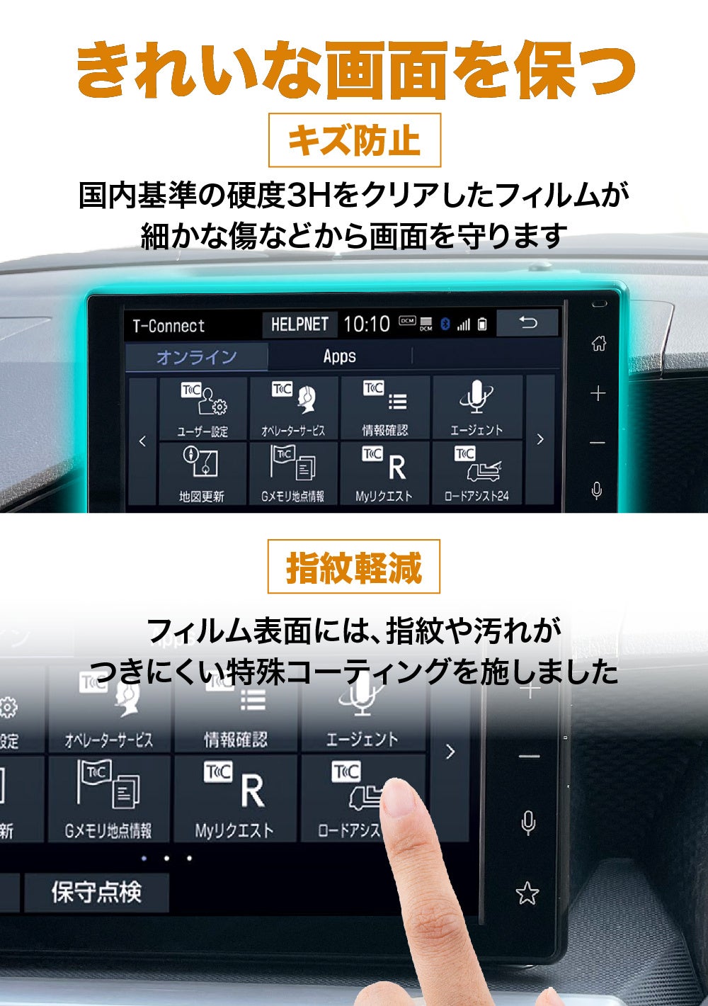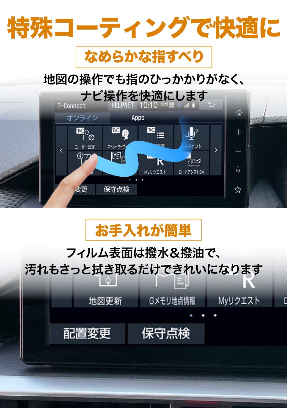 特殊コーティングにより、地図の操作でも指のひっかかりが少なく、ナビ操作を快適にします。