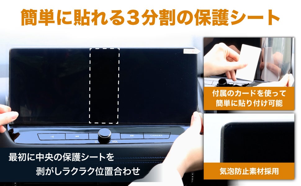 保護シートを「3分割」にすることにより、大きなナビ画面でも位置合わせがしやすく、簡単に貼り付けが可能です。また、フィルムの粘着面には特殊シリコン素材を採用。これによりフィルムは自己吸着し、気泡は入りづらく抜けやすくなります。