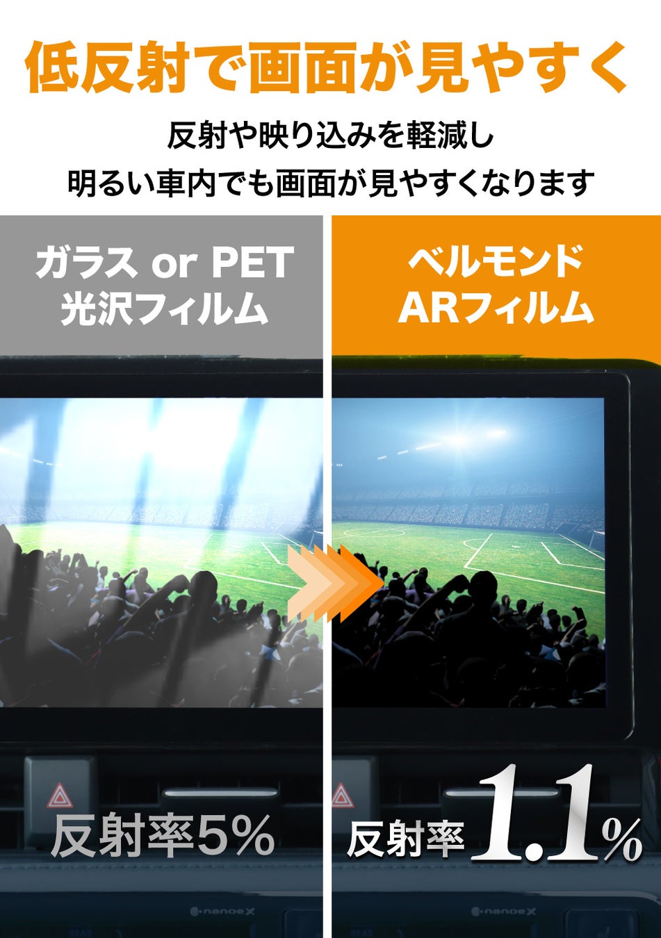 反射率1.1%の低反射フィルムなので、反射や映り込みを軽減し、明るい車内でも画面が見やすくなります。
