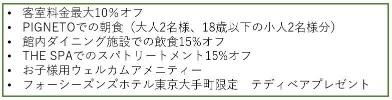 客室10%オフ、ご朝食など5つの特権付プラン。「もっとTOKYO」でのご予約、ご滞在の方はフォーシーズンズホテル東京大手町オリジナルのテディベアのぬいぐるみもプレゼント