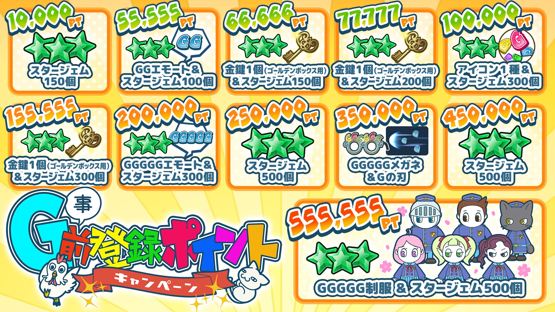 G前登録ポイントの達成報酬として、「GGGGG制服」や「GGGGGメガネ」等の限定スキンと、育成等に使えるスタージェムをプレゼントさせていただきます。2023年4月30日までにキャラクターのトロフィーランクを5まで上げた方が受け取り対象となりますのでご注意ください。