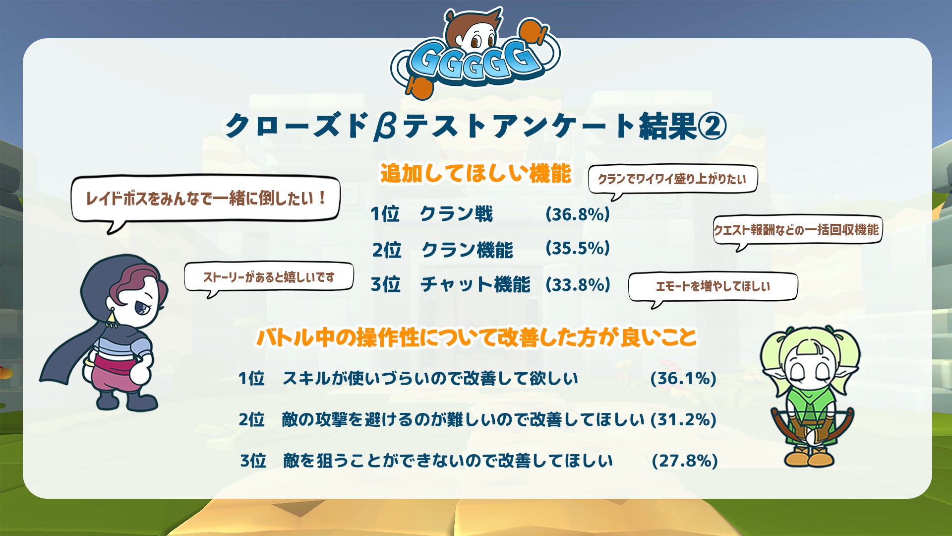 『GGGGG』は100人バトルロイヤルや8人バトルロイヤル、ダンジョン攻略を最大4人協力プレイで遊ぶことができる基本プレイ無料のスマートフォンゲームです。100人バトルロイヤルといっても、縦画面のシンプル操作なカジュアルゲームのため、誰でもどこでも気軽に遊ぶことができます。キャラクターも親しみやすいデザインとなっており、βテスト版では幅広い年代の方々にプレイしていただきました。また、β版で特にご要望の多かったクラン機能を新たに追加し、クラン内ではチャットをすることも可能となっています。今後もフレンドと集まって遊ぶことでさらに楽しめるコンテンツを追加していく予定です。『GGGGG』の公式Discordサーバーには既に1万6000人以上のファンの方々に参加いただいておりますので、GGGGGのフレンドを探したい方は公式Discordサーバーにも是非ご参加ください。