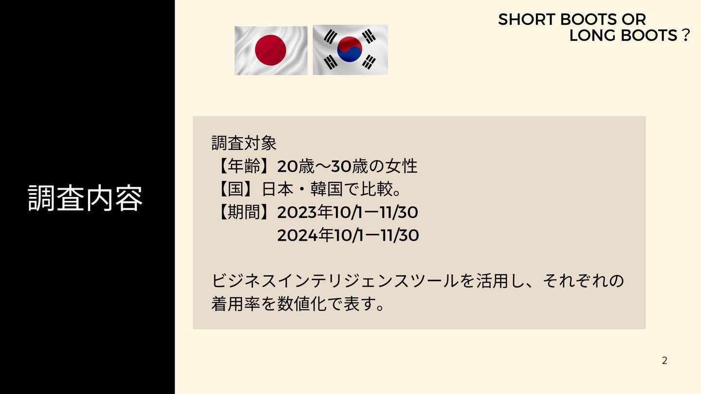 この授業内で、学生が実際に企画・データ分析した成果から、特に優秀と評価したレポートをシリーズで公開します。2025年第2弾のテーマは「ショートブーツとロングブーツの着用比率を日本・韓国で大解剖!」。