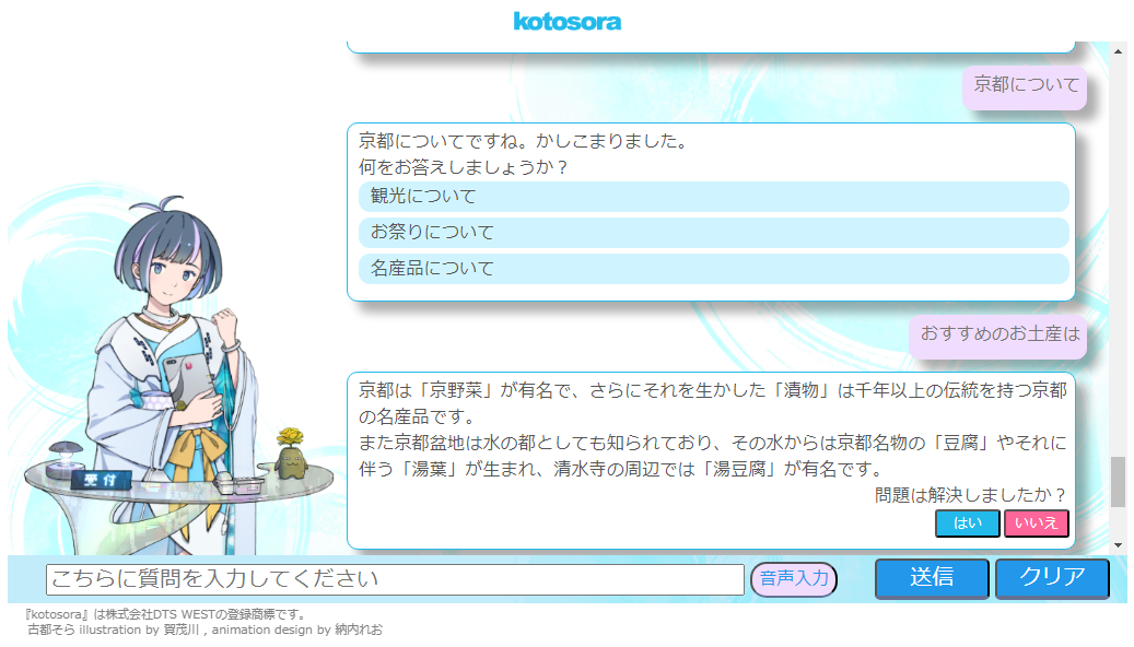 kotosoraのデモサイト画面。選択肢をクリックするほか、画面下部の入力欄や音声入力からも質問できる