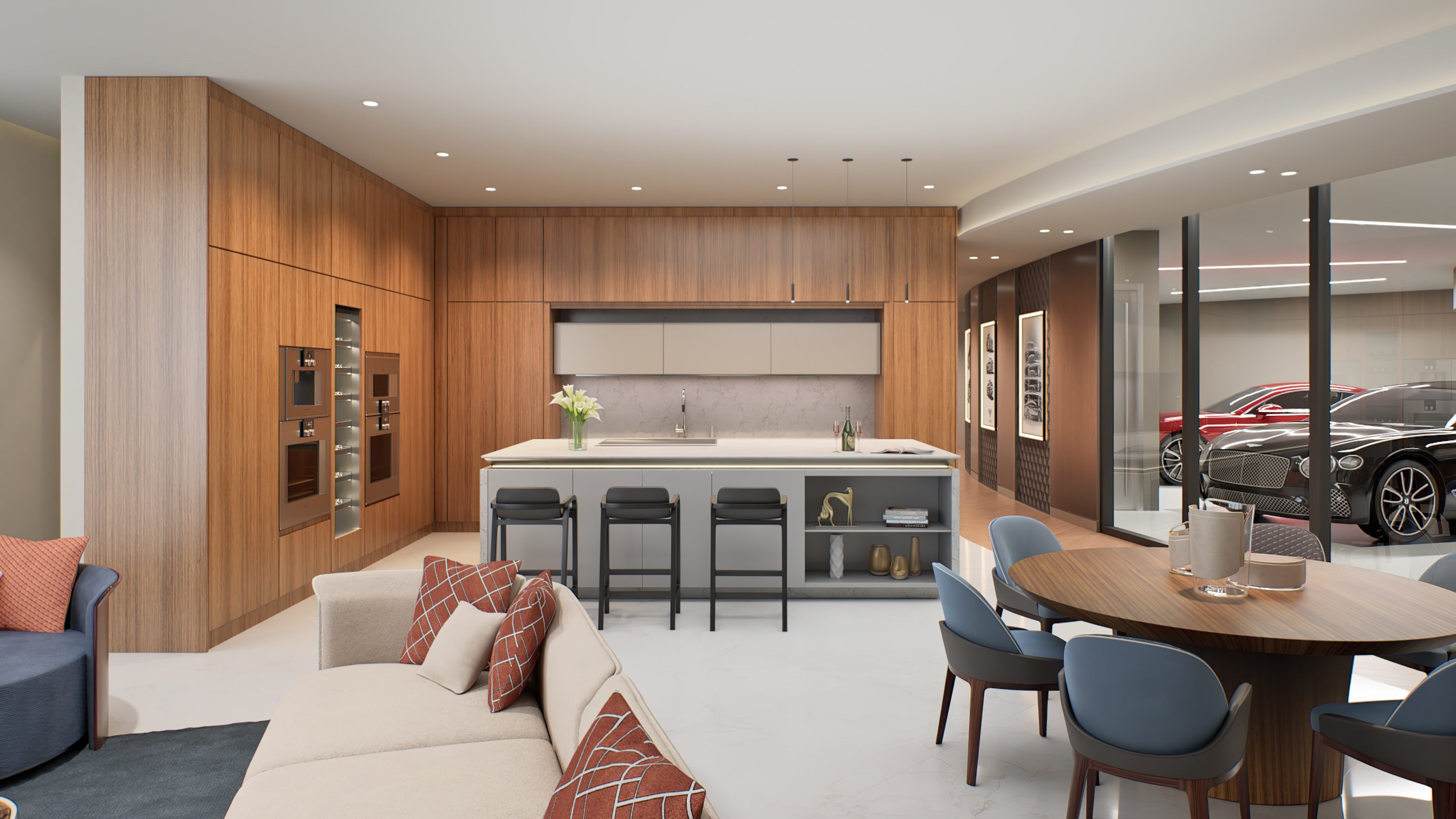 最上階の61階まで、各住戸内に3台または4台駐車可能なプライベートガレージが用意され、希望すればEV充電設備を設置することもできますので、利便性と安全性に優れ、プライバシーが守られた空間で大切な愛車を保管できます。居住者が所有するクルマにはすべてRFIDタグが貼られる予定です。ベントレーレジデンスにクルマで到着するとRFIDタグが自動で読み取られます。すると、高度な照明システムが作動し、自宅に移動するための正しいデザーベーターへとドライバーを誘導します。ID情報が自動で認識されるため、ドライバーは降車したりボタンを押したりする必要がなく、そのまま自宅前まで移動できます。
