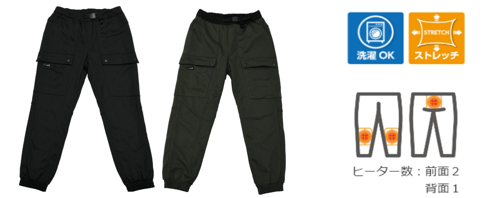 カーゴパンツタイプの調整しやすいベルト仕様のヒーターパンツ