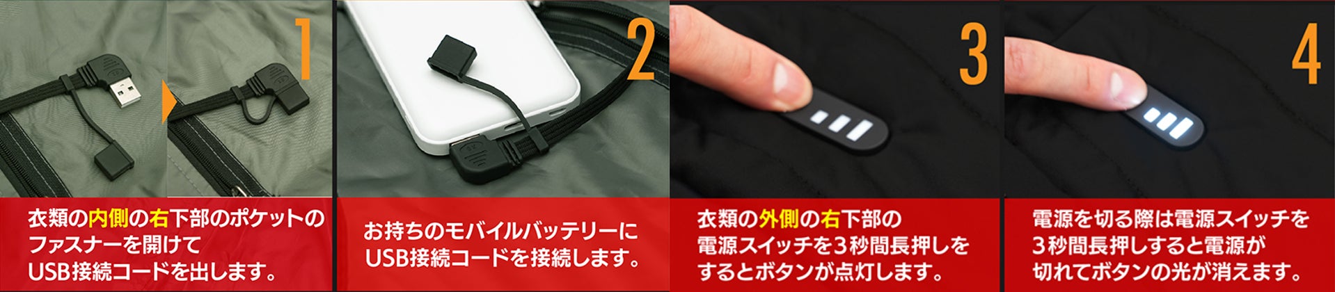 ヒーター内蔵ウェアはモバイルバッテリーに接続し、スイッチを長押しすることですぐにヒーターが温まります。