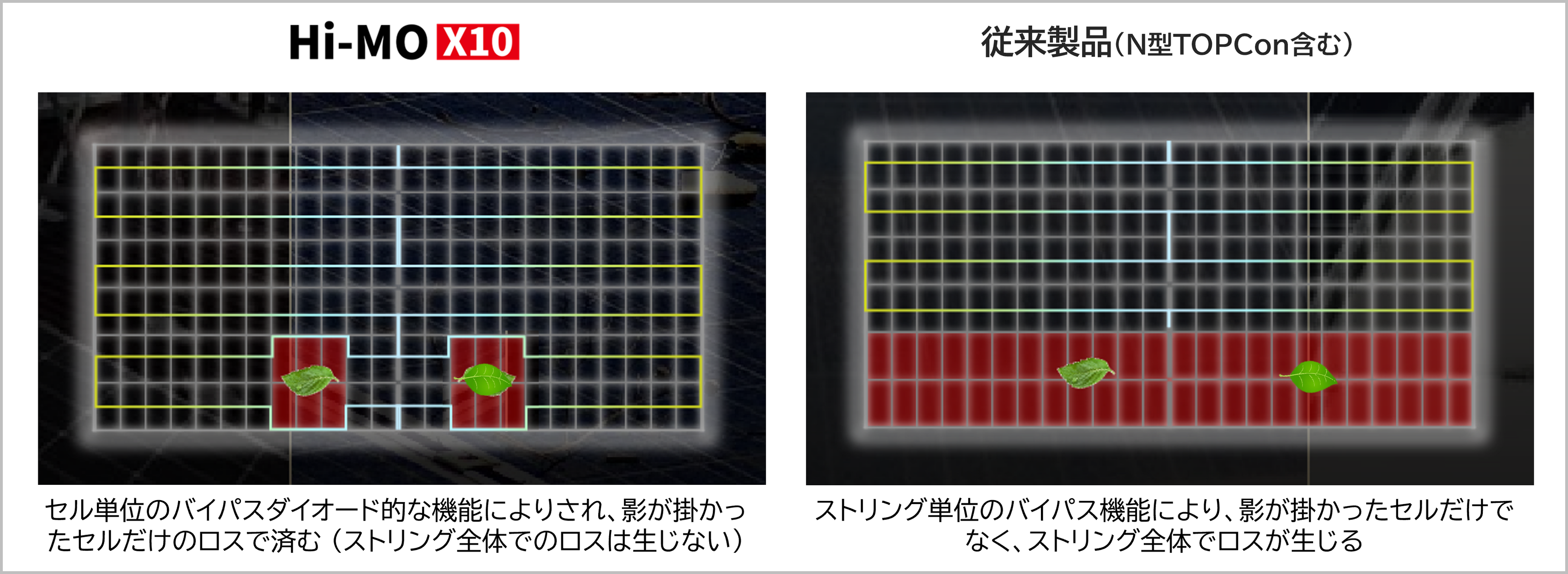 Hi-MO X10は、セル単位でのバイパスダイオード的な機能により、部分的な影による出力の大幅な損失を70%以上抑制します。また、局所的な過熱を28%低減することで故障や火災のリスクを軽減し、安全性の向上が期待できます。