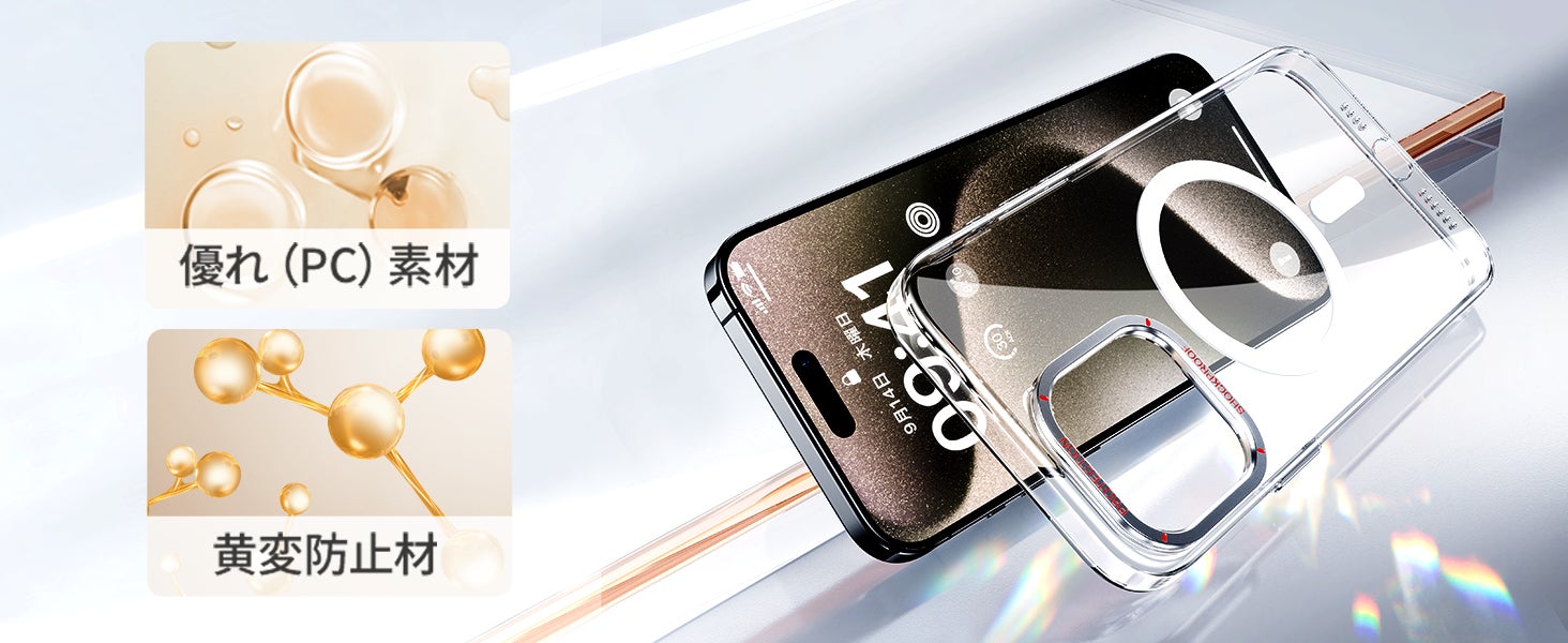 「機巧シリーズ保護ケース」は高透明度ポリカーボネート素材を採用、iphone15本来の崇高な美しさと色をそのままに生かし、iPhone本体の高級感にも劣らない美しさです。従来品より優れたポリカーボネート(PC)素材でドット加工なしでもクリアケースにありがちな変色劣化を徹底的に解消できます。