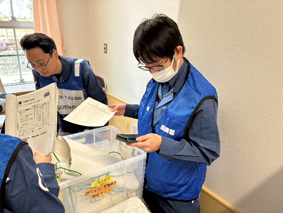 実証には、災害発生時に避難所業務に従事する区職員が参加しました。参加者は総務部、情報部、給食・物資部、衛生・救護部の4グループに分かれ、既存のアクションカードとN-HOPSを併用しながら、施設点検、受付設営、生活場所の準備、応急給水栓の開設、マンホールトイレの設置など、避難所開設に至る一連の手順を実動形式で確認しました。