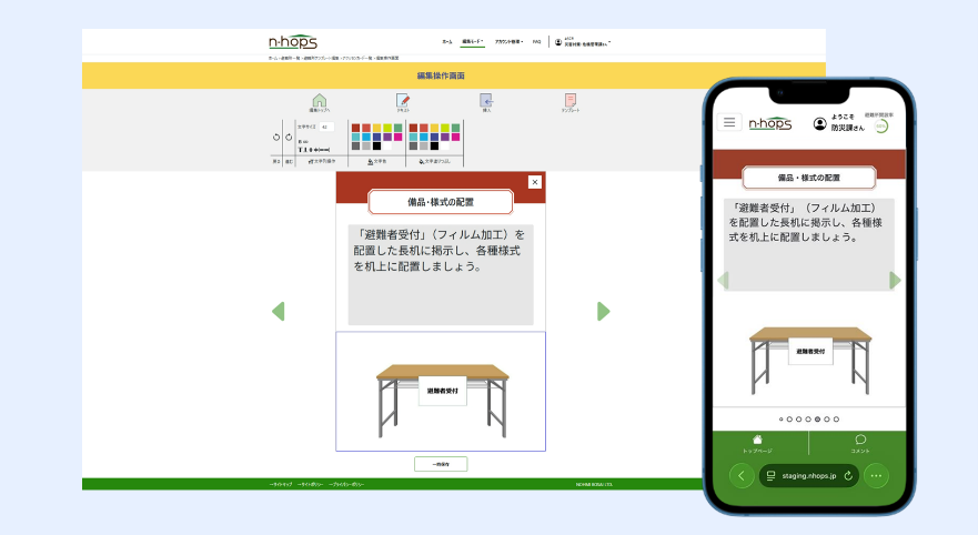 災害時には通信環境の変動が想定されます。N-HOPSはWebアプリケーションとして利用でき、あらかじめデータを端末へ保存することで、オフライン環境下でも行動支援ガイドを閲覧できる設計としています。