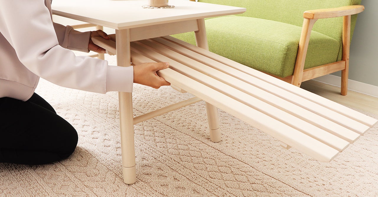 一般的なローテーブルは天板までの高さが40cmほどのものが多いですが、SAVOIR(サヴォア)はそれより10cm高い50cm。そのためビーズクッションや座椅子、ソファに座って使うのにちょうどいいサイズとなっています。