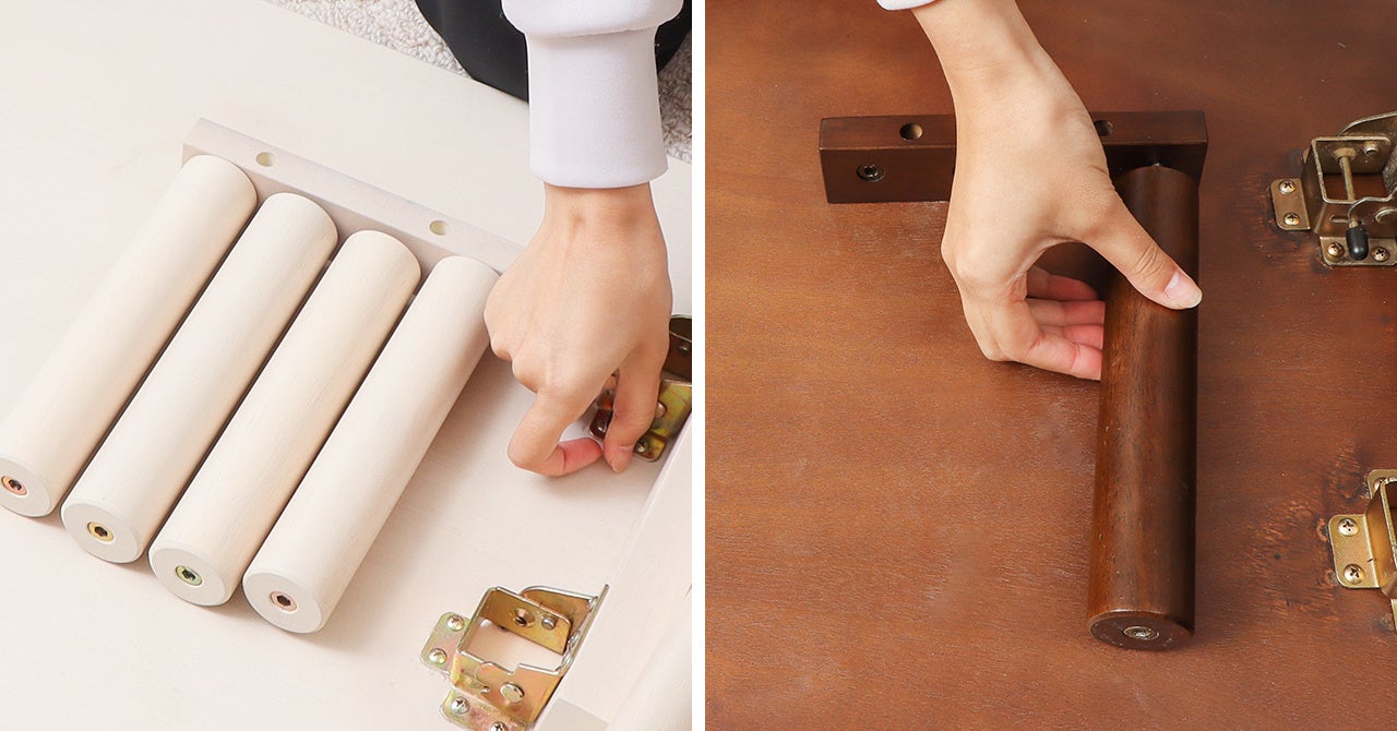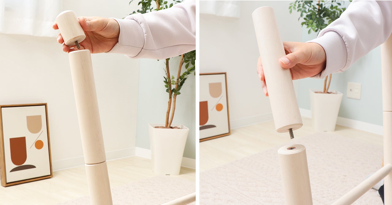 商品は完成品でのお届けとなるので、届いてすぐにお使いいただけます。脚は継ぎ脚で、手でくるくると回すだけで簡単に取外し&取付けができます。