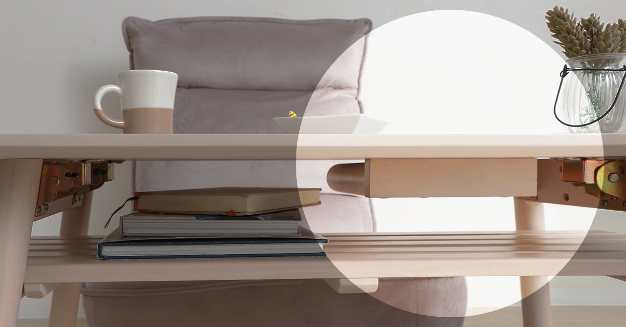 しかも脚がペタンと折りたたむことができ、12cmほどの薄さになるので使わない時はコンパクトに収納が可能。折れ脚テーブルにはめずらしく棚が付いているので、雑誌やリモコンなどの小物をサッと片付けられ便利です。