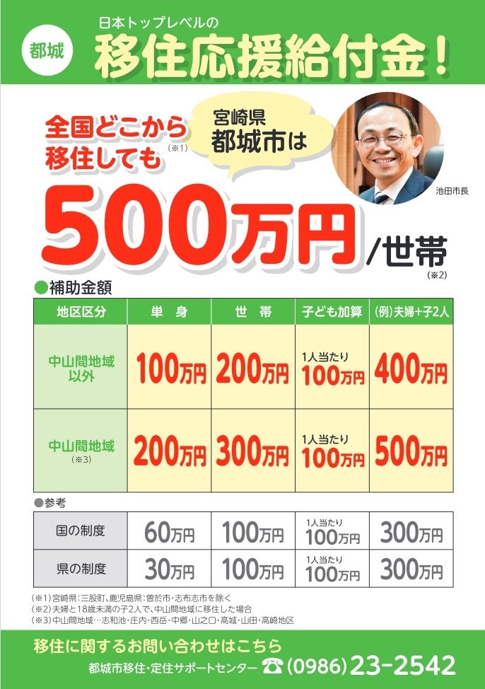 宮崎県都城市は、人口減少対策の一環として、移住者を呼び込むため、日本トップレベルの大胆な移住支援を実施します。