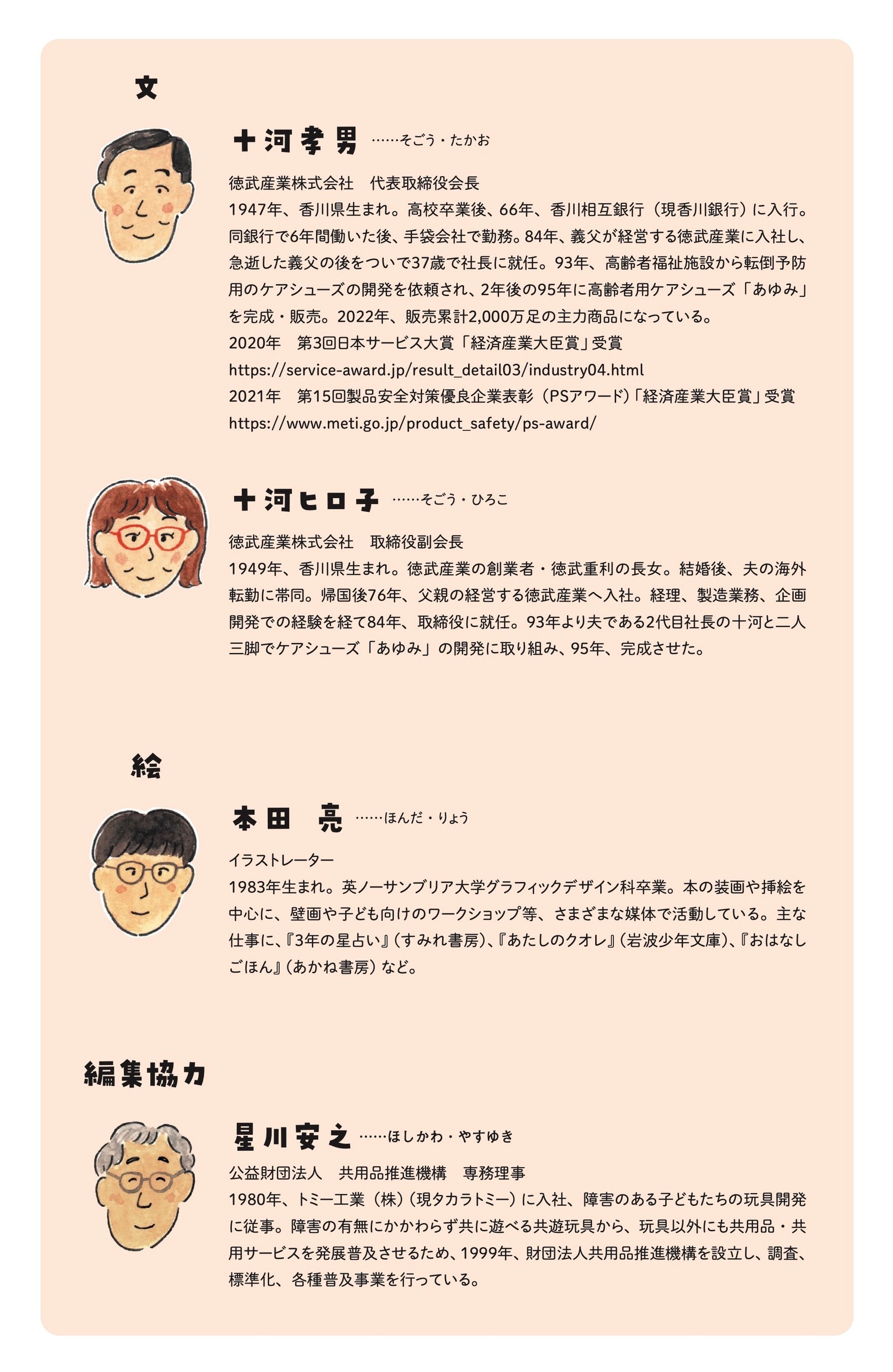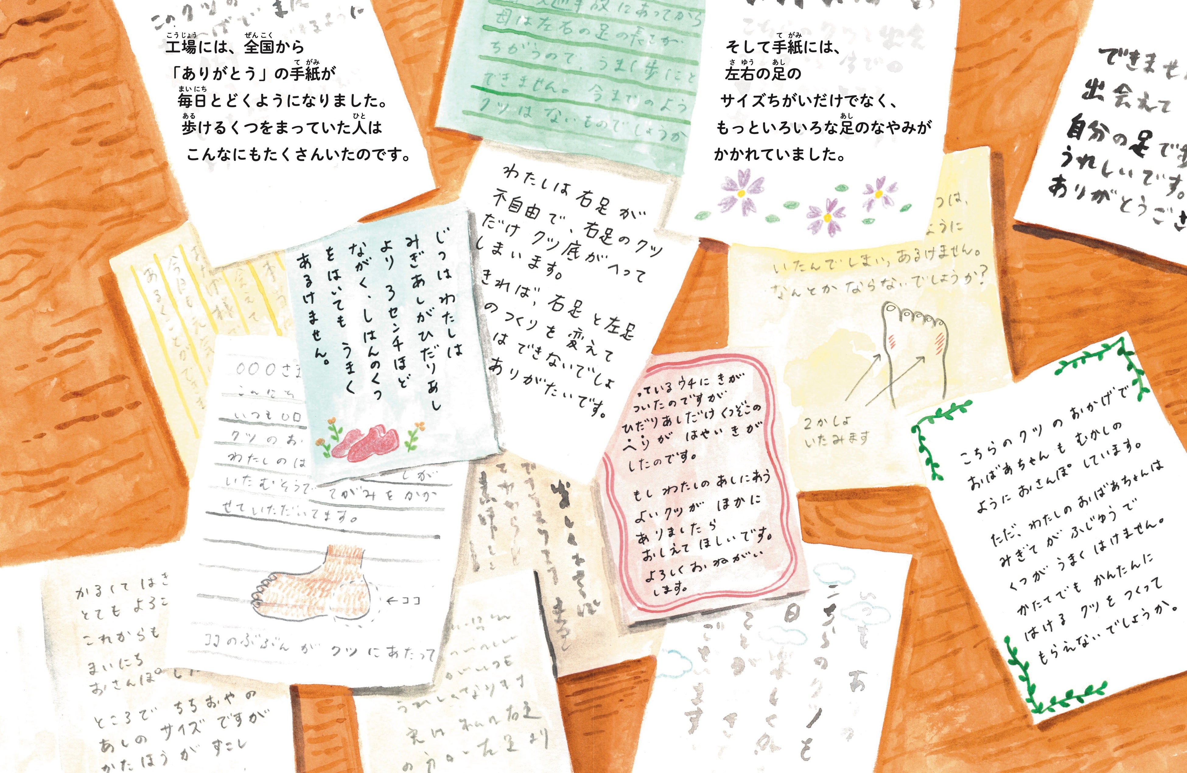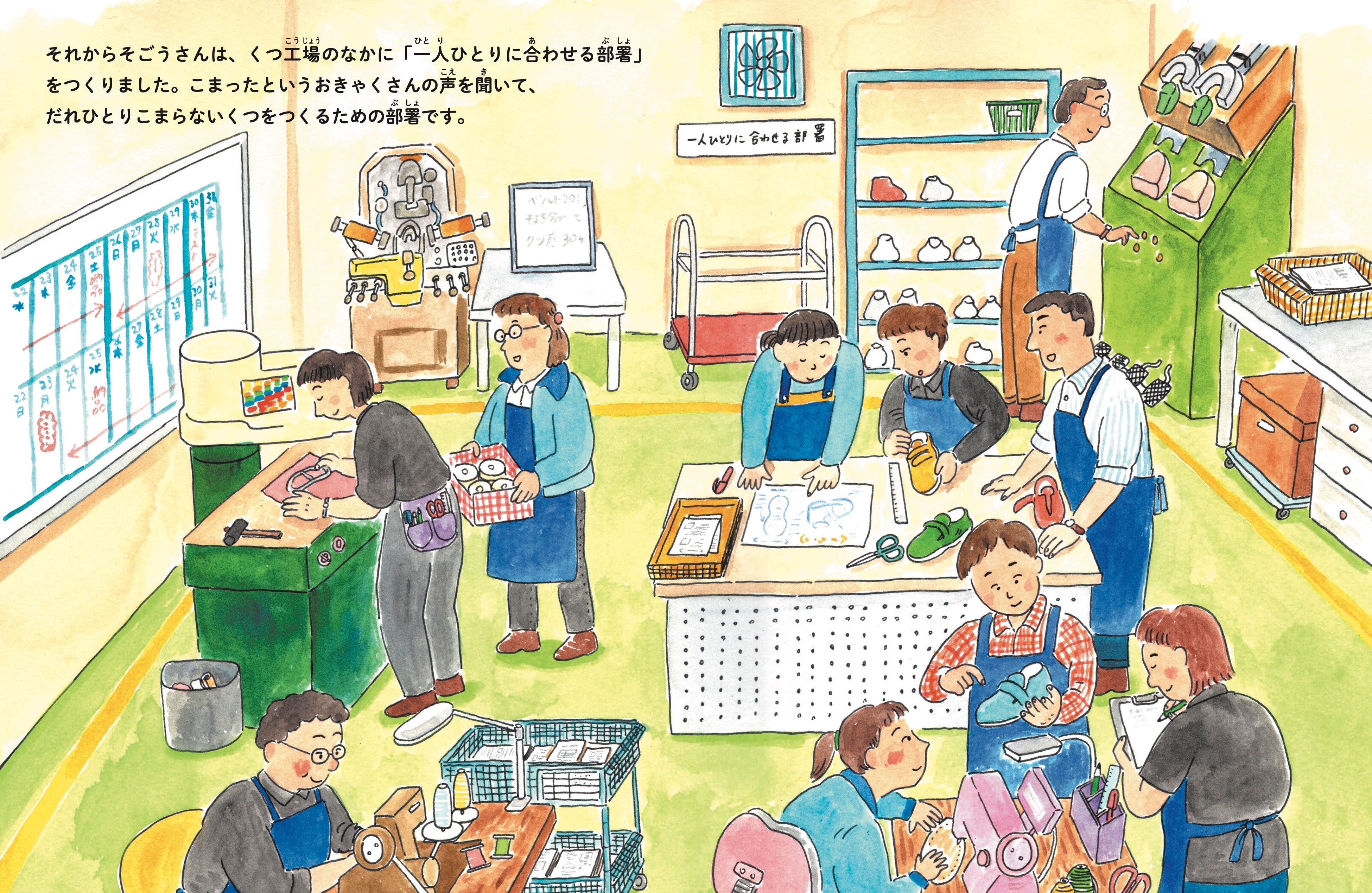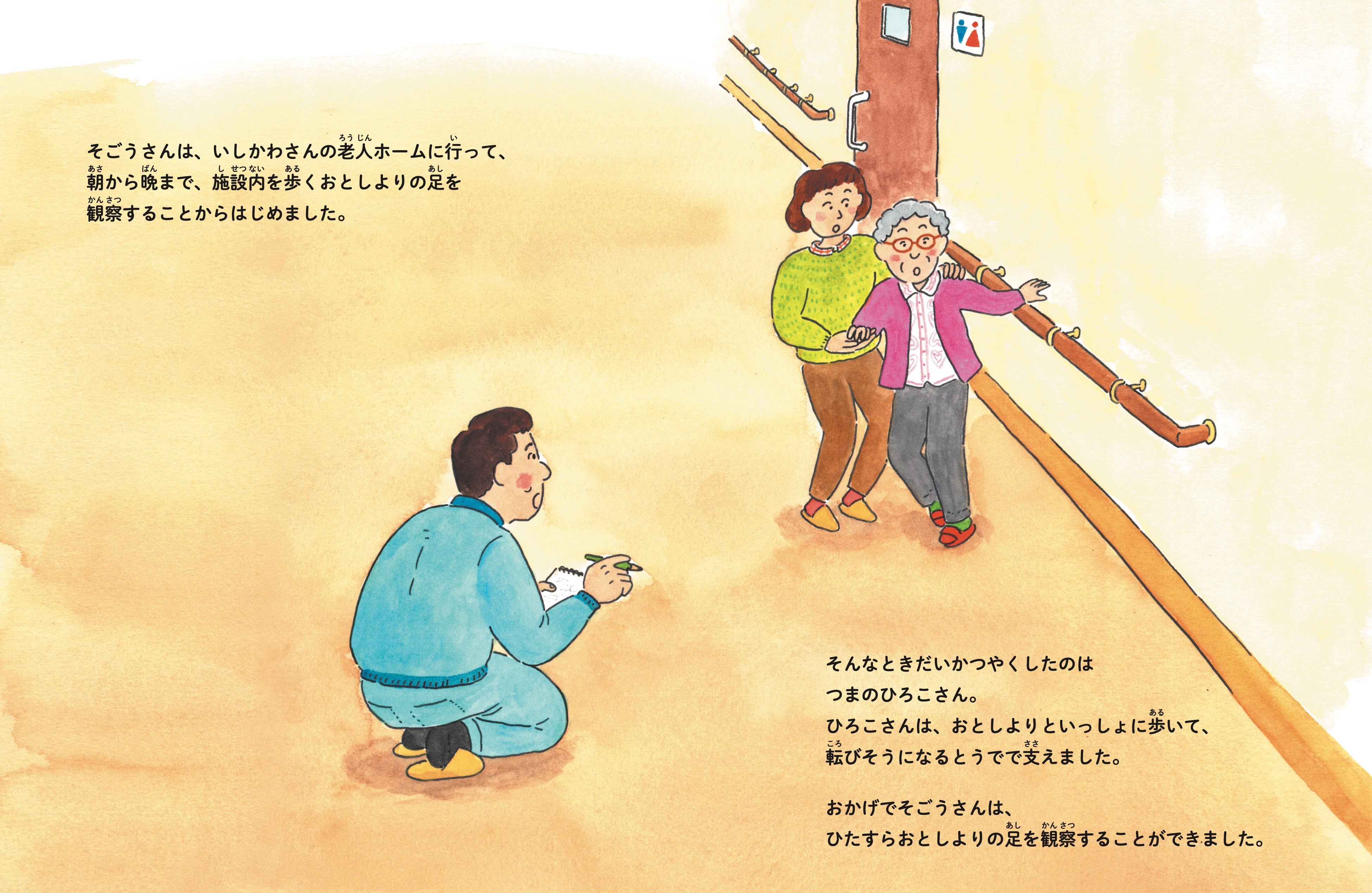 ・十河さん夫婦が書いた文は、困った人の助けになりたいという熱意から「転びにくい靴」に取り組む実際にあったお話です。十河さんが考えたアイディアを子どもたちにも理解しやすいような説明があり、工場で働く人たちの絵が細かく描かれています。また、巻末にある十河ヒロ子さんの「見えない力で出来ている靴」という文章は、より具体的に実状が語られていて、支えとなる応援の力に感銘を受けました。一人ひとりの想いに応えてくれる靴やさん、私も心から応援します!(ブロガー)