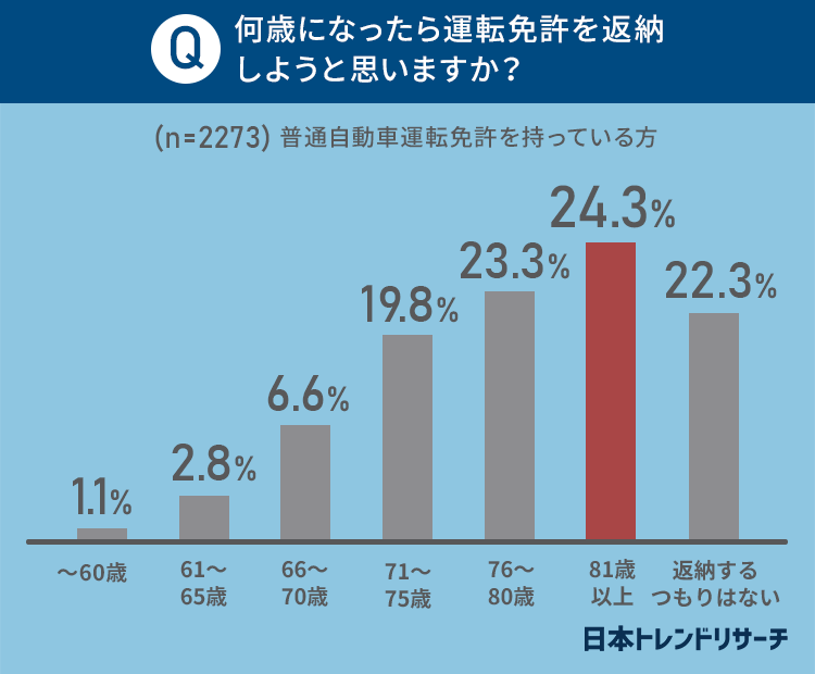 「60歳以下の年齢で返納を考えている」方は1.1%で、最も多かった回答は24.3%で「81歳以上」でした。