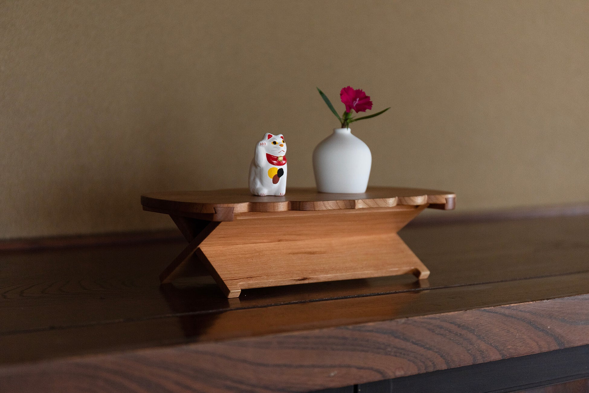 八女福島仏壇の技術から生まれた雲型アウトドア用ミニテーブル。商品製造は福岡県大川市の立野木材工芸株式会社。 折り畳み式で携帯しやすいデザインは、アウトドアだけでなく、室内でも使い方自由自在。