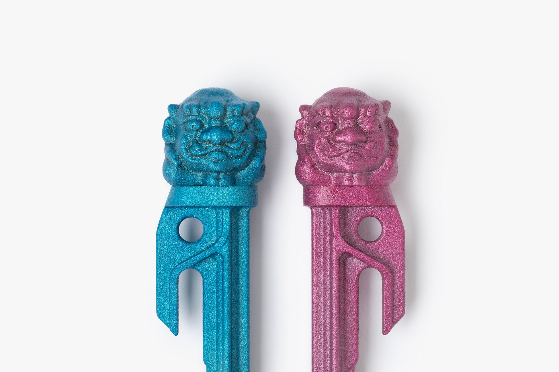 博多人形師小副川太郎がデザイン・造形した原型の素材を置き換えて、「オニ」の頭が頂部にくっついたアルミ鋳物ペグ。 商品製造は福岡のエフキャスト株式会社。赤・青対でテント入口に設置し魔除けに。