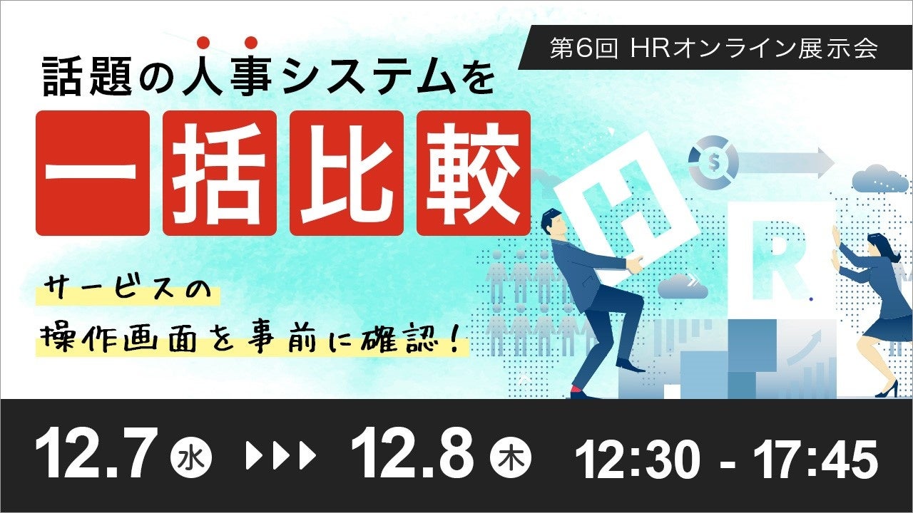 今回の「HRオンライン展示会」では、「勤怠管理」「給与計算」「労務管理」「タレントマネジメント」「組織改善ソリューション」「採用管理」の6つのカテゴリーを用意しています。カテゴリーごとにデモ画面を用いて、より具体的に人事システムをご紹介しますので、社内でシステム導入をご検討されている方は、是非ご参加ください。