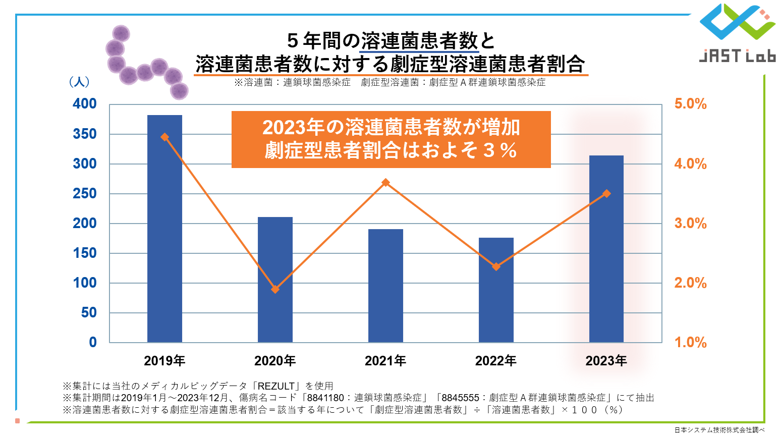 最近のニュースでは、劇症型溶連菌患者数の増加が連日報道されています。当社データでも、この傾向を調査した結果が以下の通りです。