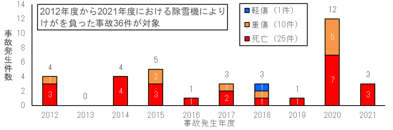 除雪機の事故は毎年発生しています。全国的に降雪量が少なかった2019年度の事故は1件、各地で大雪となった2020年度は12件、降雪量が平年並みか多い地域があった2021年度は3件と、降雪量が増えて使用機会が増えると事故件数も増加する傾向がみられます。また、2021年度は3件とも死亡事故となっており、死亡事故の発生が続いています。