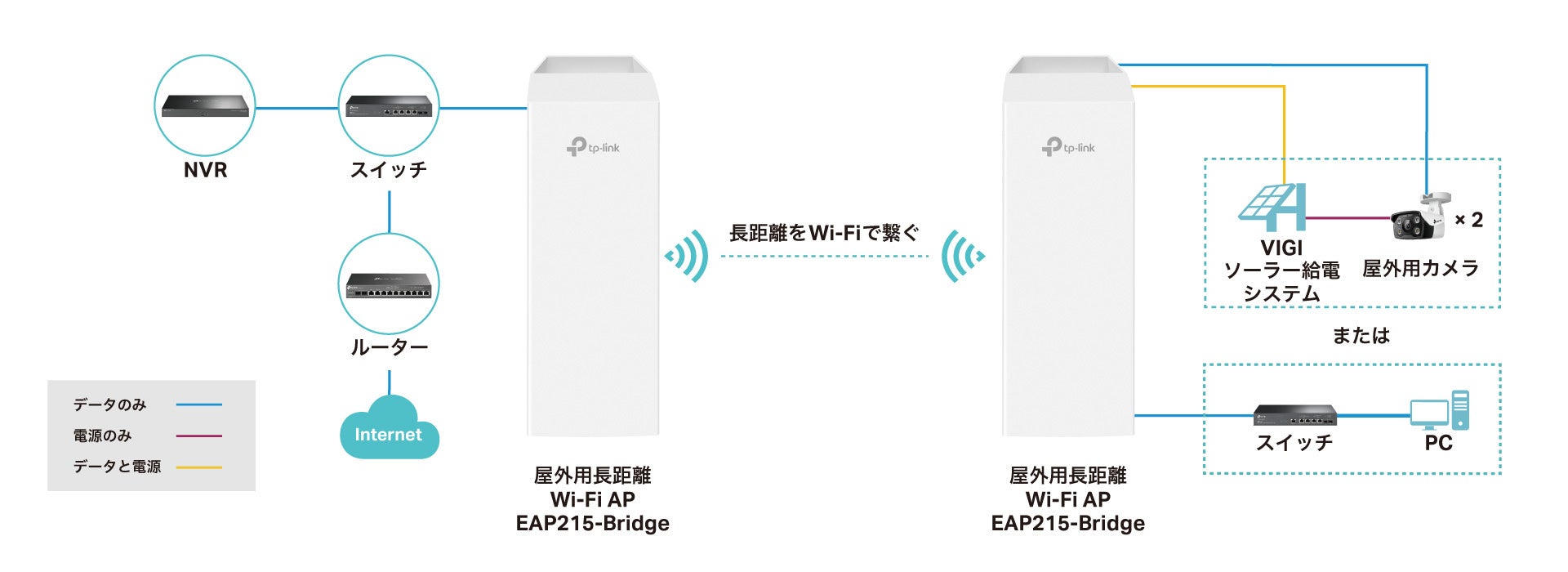 TP-Link VIGIシリーズへ新たに仲間入りしたソーラーパネル「VIGI SP9030」と長距離AP「EAP215-Bridge KIT」を活用することで、電源供給が難しい山間部や工事現場等へのセキュリティカメラの導入を実現します。