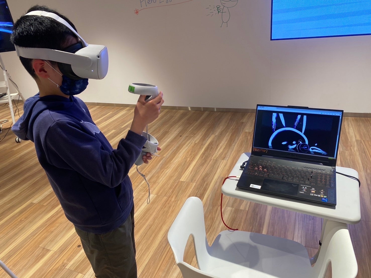 会場には小学生・中学生の参加者が集まりました。最年少では7歳の子がVRデバイスを装着し、自らの手でデジタル空間に立体的なアートを描くという、普段できない体験をしました。