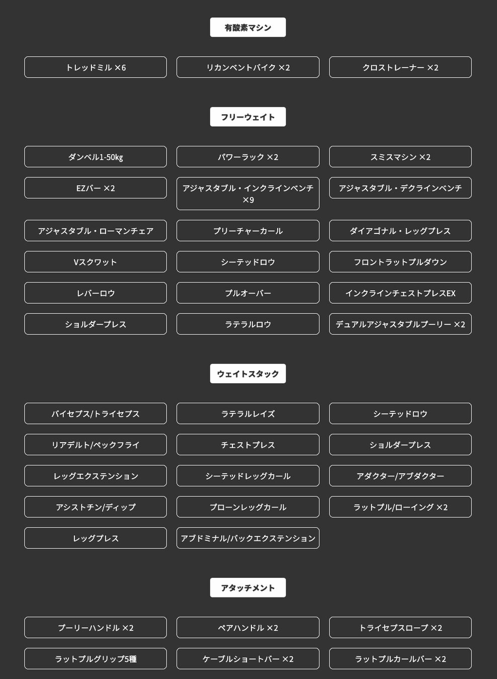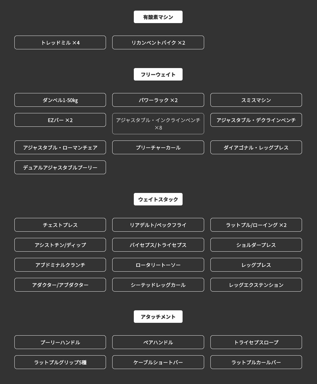 ダンベルやケーブルマシン、パワーラックなど基礎トレーニングに欠かせない設備も充実しています。