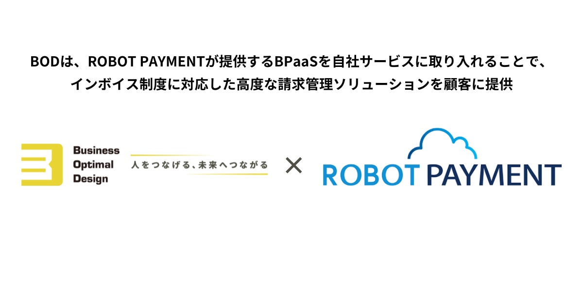 東京都(2025年2月6日) - 請求代行をはじめとするアウトソーシングサービスを提供する株式会社BOD(本社:東京都豊島区、代表取締役:田中大善、以下BOD)は、請求・債権管理業務を管理・統合・自動化するシステムを提供する株式会社ROBOT PAYMENT(本社:東京都渋谷区、代表取締役:清久 健也、証券コード:4374、以下ROBOT PAYMENT社)との業務連携を新たに開始します。また、本提携は、インボイス制度の導入に伴う請求管理の高度化に対応することを目的としています。