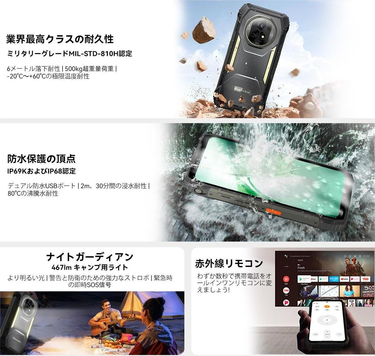 本機は、IP68/IP69Kの防水防塵、およびMIL-STD-810H規格の耐衝撃仕様に準拠。水深2mでの耐水性、6mからの落下耐性、500kgの耐圧強度を誇り、雨天や砂埃の中、極地環境でも動作します。