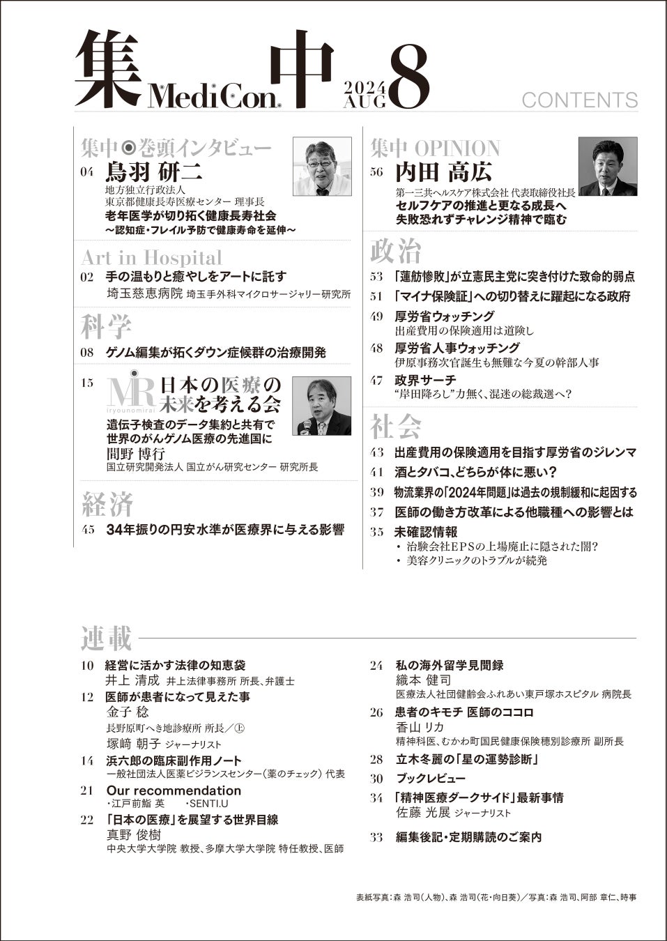 医療情報誌 月刊『集中』2024年8月号 巻頭インタビュー 鳥羽研二 地方独立行政法人東京都健康長寿医療センター 理事長/集中OPINION 内田高広 第一三共ヘルスケア株式会社 代表取締役社長 他