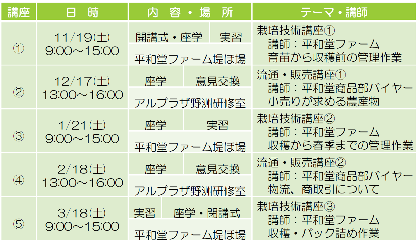 この講座は、公益財団法人滋賀県農林漁業担い手育成基金と協力し、概ね1年以内に滋賀県内においていちご栽培で就農を目指す方を対象に、ファームでの実習と平和堂のバイヤーとの意見交換などの座学で学ぶことができるもので、平和堂ファームとして初めての試みです。長年、小売業で培った経験をもとに栽培方法だけでなく、流通・販売まで一貫して学ぶことのできる実践的な講座です。