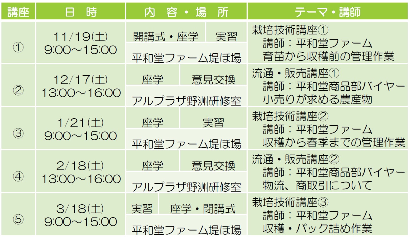 株式会社平和堂(滋賀県彦根市、代表取締役社⻑執⾏役員︓平松正嗣、以下「平和堂」)は、滋賀県内で新規に独立就農を目指す方を対象とした「新規就農のためのいちご実践講座@平和堂ファーム」の開講にあわせて、11月19日(土)あさ10時30分から、野洲川歴史公園サッカー場ビッグレイクにて開講式を行いますのでお知らせします。