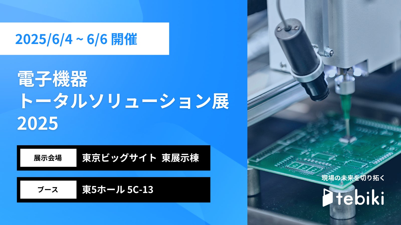 デスクレスワーカー向け現場支援システムを提供するTebiki株式会社(本社:東京都新宿区、代表取締役:貴山敬 / 以下、Tebiki)は、2025年6月4日(水)から6月6日(金)まで、東京ビッグサイト(東京都江東区)にて開催される「電子機器トータルソリューション展 2025」に出展します。