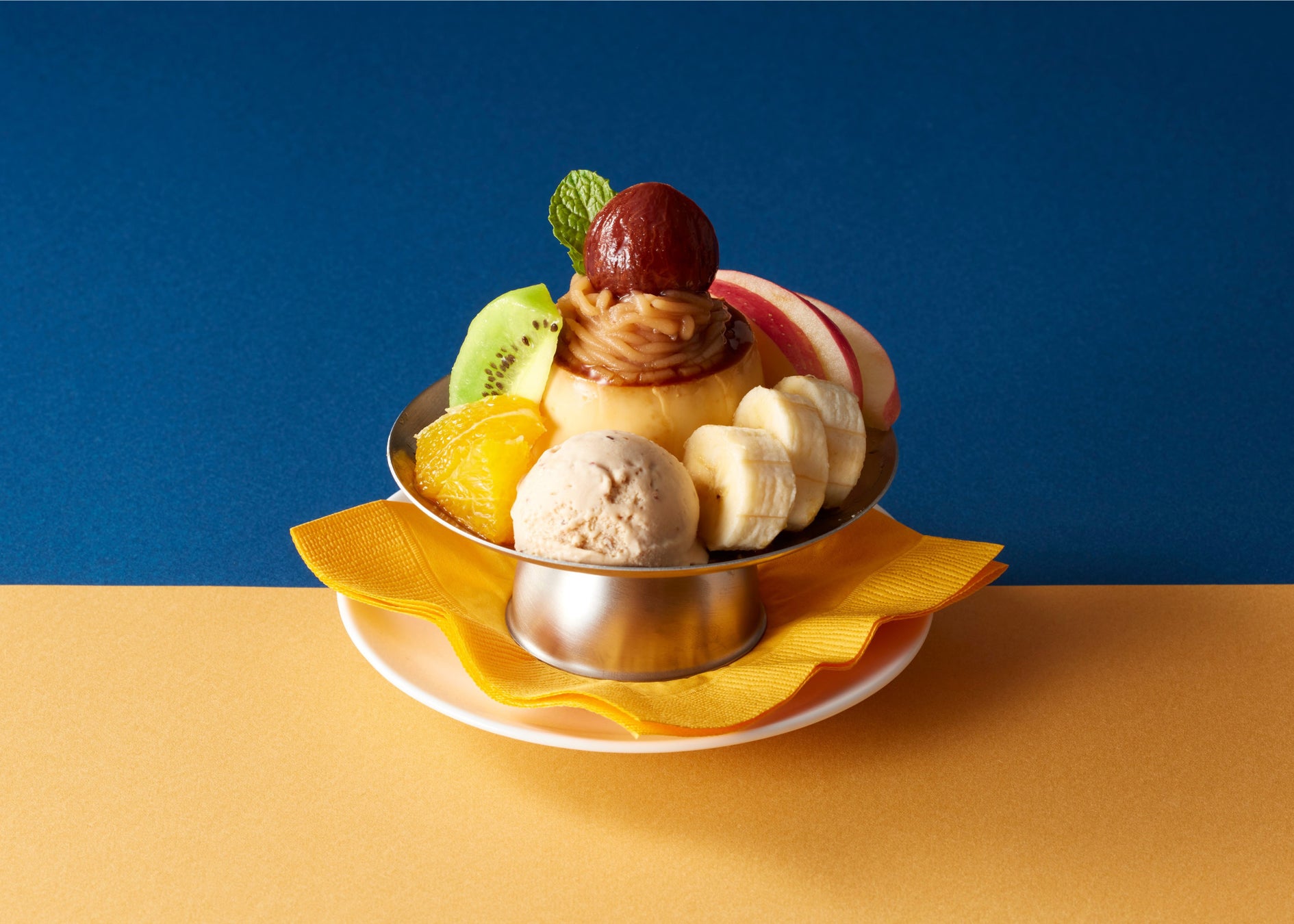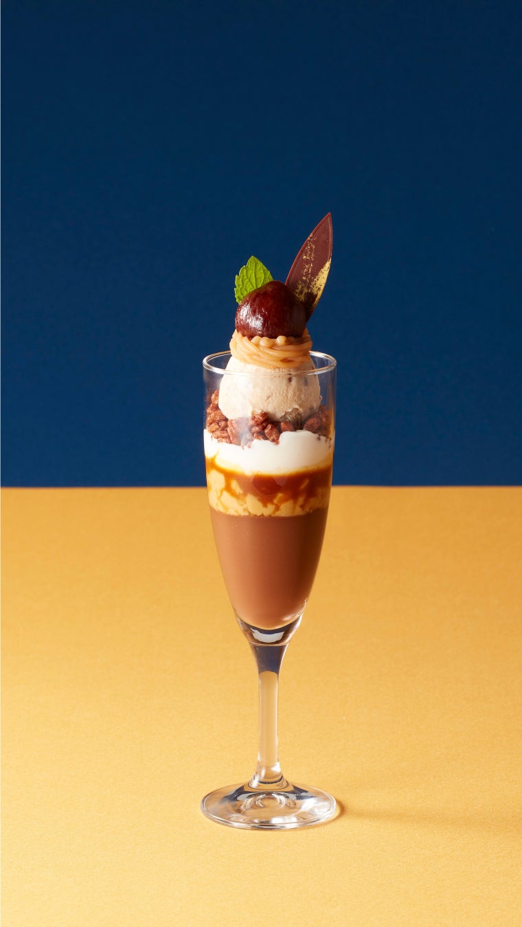 上部にあしらった渋皮栗とマロンクリーム、渋皮栗アイスで、栗をご堪能いただけます。コクのある塩キャラメルソースとほろ苦いチョコプリンが、栗の甘みを引き立てます。食後にぴったりのミニサイズパフェです。