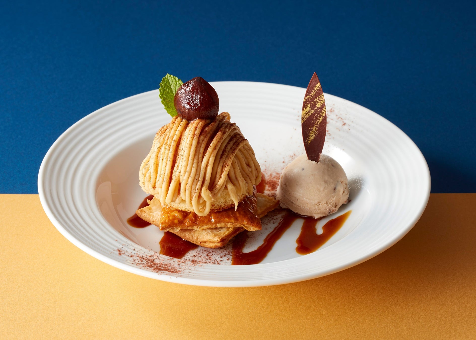 イタリア産の栗を使用したなめらかなマロンクリームを挟んだサクサクのパイ生地の上に、しっとりとした和栗クリームを使用したモンブランと渋皮栗をのせ、渋皮栗アイスを添えました。お皿の表面にあしらったコクのある塩キャラメルソースと一緒にお楽しみください。