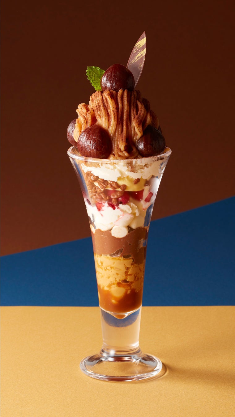 注文が入ってから、店内で一品ずつ手絞りするなめらか食感のモンブランを堪能できるパフェです。上部にあしらった渋皮栗とイタリア産の栗を使用した濃厚な渋皮入りマロンクリーム、栗の食感を残した渋皮栗アイスで、旬の栗を心ゆくまでご堪能いただけます。程よい甘みの栗を引き立てるのは、フランス産ロレーヌ岩塩を使用したコクのある塩キャラメルソースと、スッキリとした甘みのキャラメルゼリーです。もちもちのマシュマロやザクザクのチョコクリスピー、なめらかでほろ苦いチョコプリンが食感にアクセントを加えます。