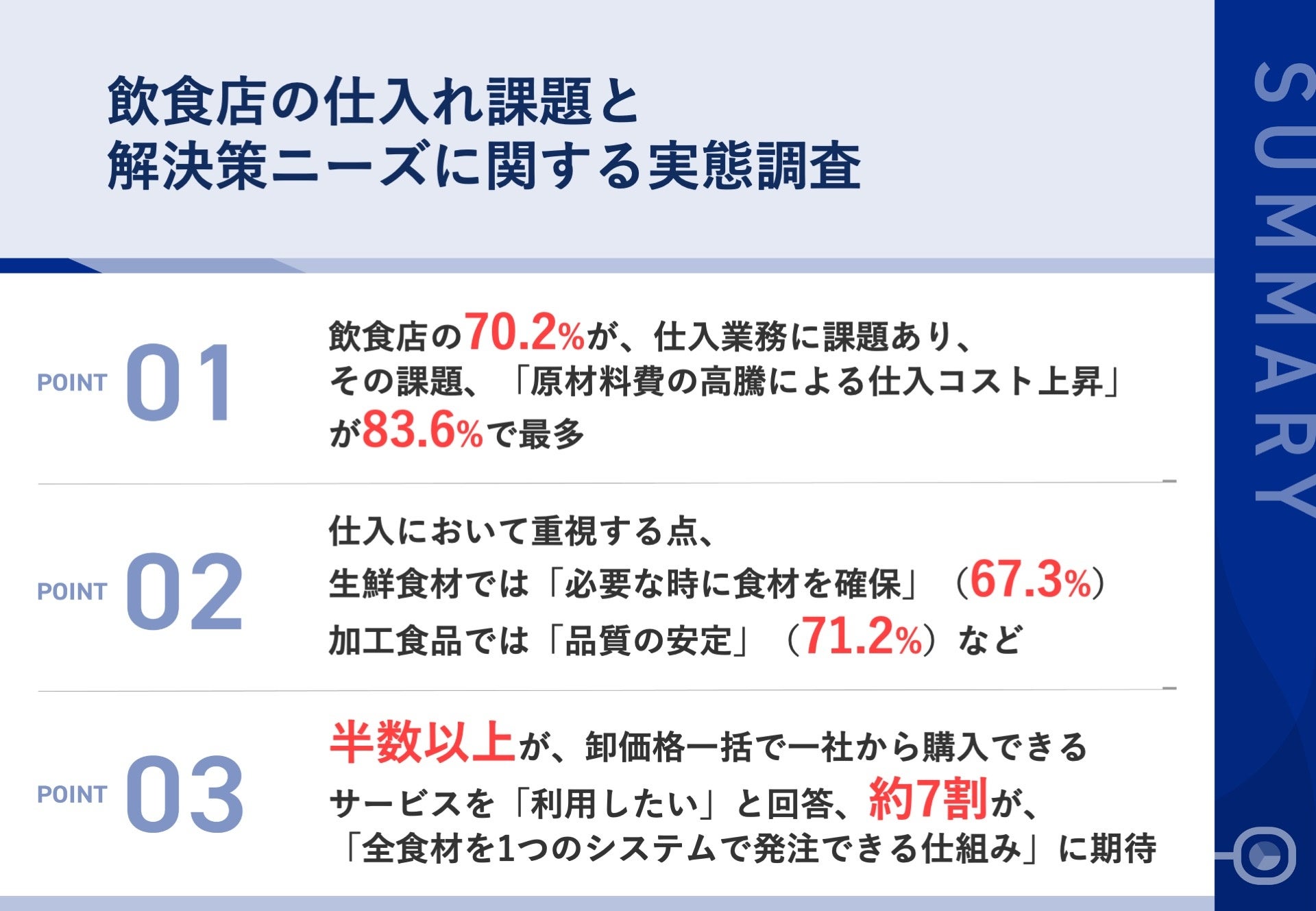 まず、飲食店の70.2%が、仕入業務に課題を感じており、特に「原材料費の高騰で仕入コストが上がり続けている」(83.6%)が大きな課題となっていることが分かりました。また、仕入において重視する点として、生鮮食材では「必要な時に食材が確実に手に入ること」(67.3%)、加工食品では「品質が安定していること」(71.2%)などが挙げられました。さらに、毎月1万円の定額で、様々な商品を卸価格一括で一社から購入できるサービスについては、半数以上が「利用したい」と回答し、約7割が、「すべての食材を1つのシステムで発注できる仕組み」に期待を寄せています。