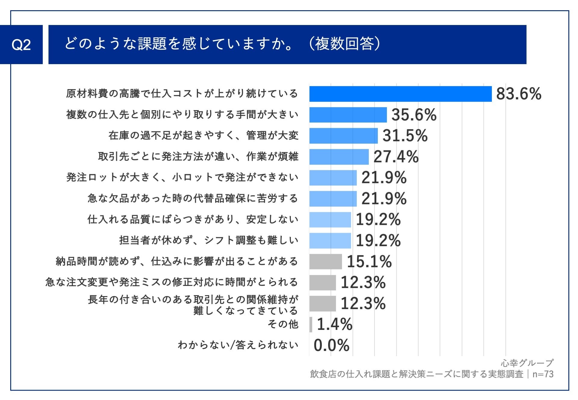 Q1で「とても課題を感じている」「ある程度課題を感じている」と回答した方に、「Q2.どのような課題を感じていますか。(複数回答)」(n=73)と質問したところ、「原材料費の高騰で仕入コストが上がり続けている」が83.6%、「複数の仕入先と個別にやり取りする手間が大きい」が35.6%、「在庫の過不足が起きやすく、管理が大変」が31.5%という回答となりました。