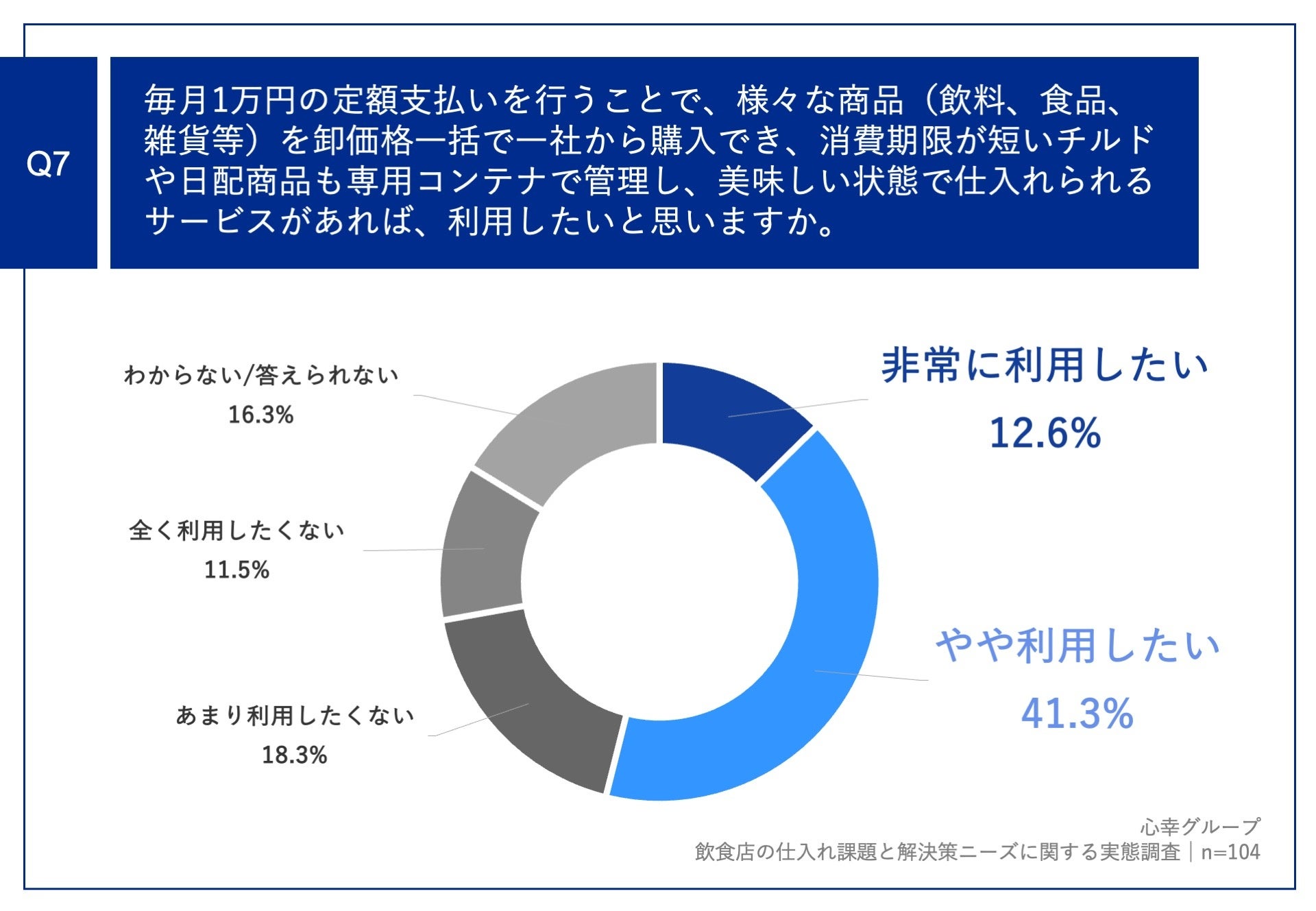 「Q7.毎月1万円の定額支払いを行うことで、様々な商品(飲料、食品、雑貨等)を卸価格一括で一社から購入でき、消費期限が短いチルドや日配商品も専用コンテナで管理し、美味しい状態で仕入れられるサービスがあれば、利用したいと思いますか。」(n=104)と質問したところ、「非常に利用したい」が12.6%、「やや利用したい」が41.3%という回答となりました。