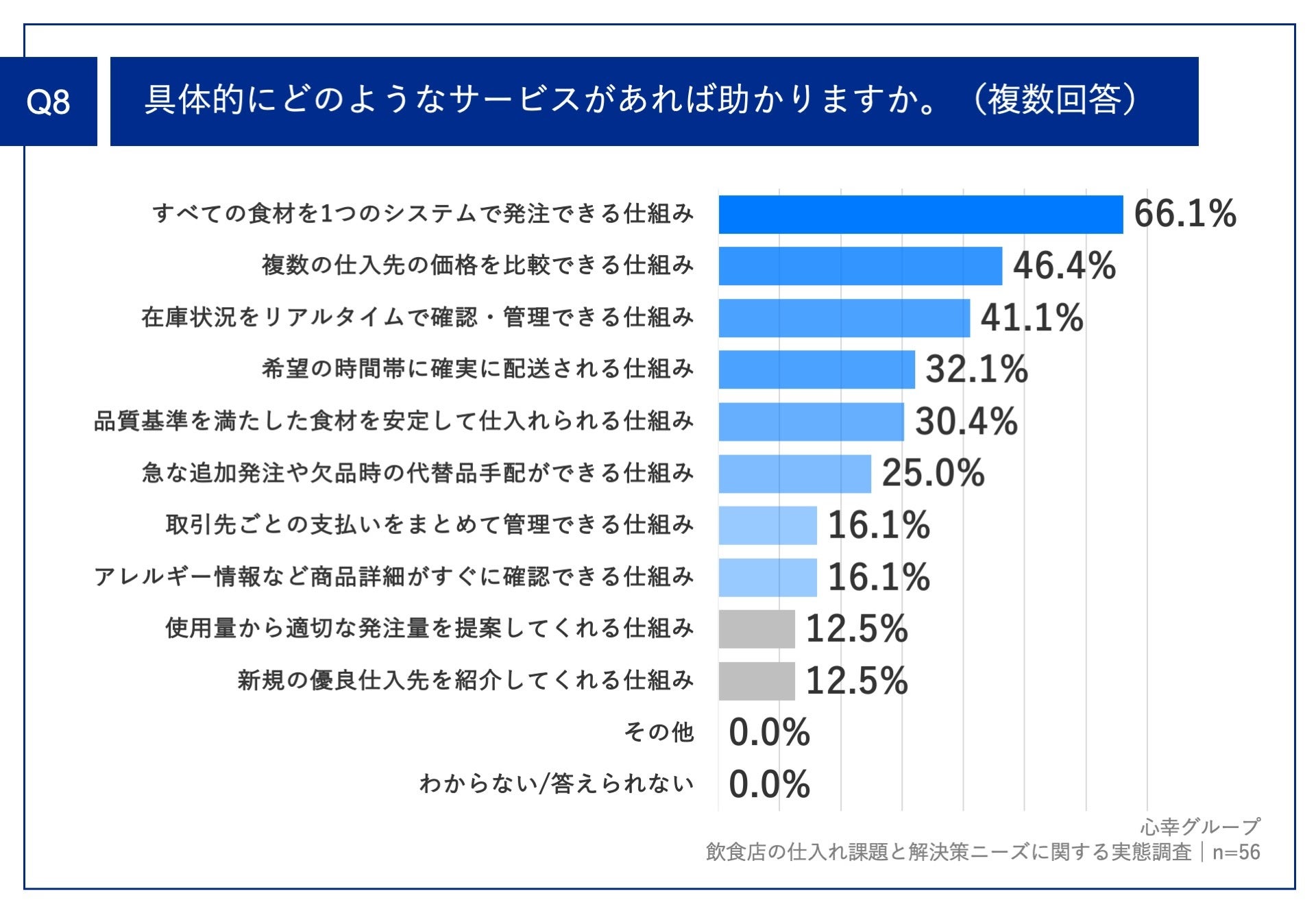 Q7で「非常に利用したい」「やや利用したい」と回答した方に、「Q8.具体的にどのようなサービスがあれば助かりますか。(複数回答)」(n=56)と質問したところ、「すべての食材を1つのシステムで発注できる仕組み」が66.1%、「複数の仕入先の価格を比較できる仕組み」が46.4%、「在庫状況をリアルタイムで確認・管理できる仕組み」が41.1%という回答となりました。
