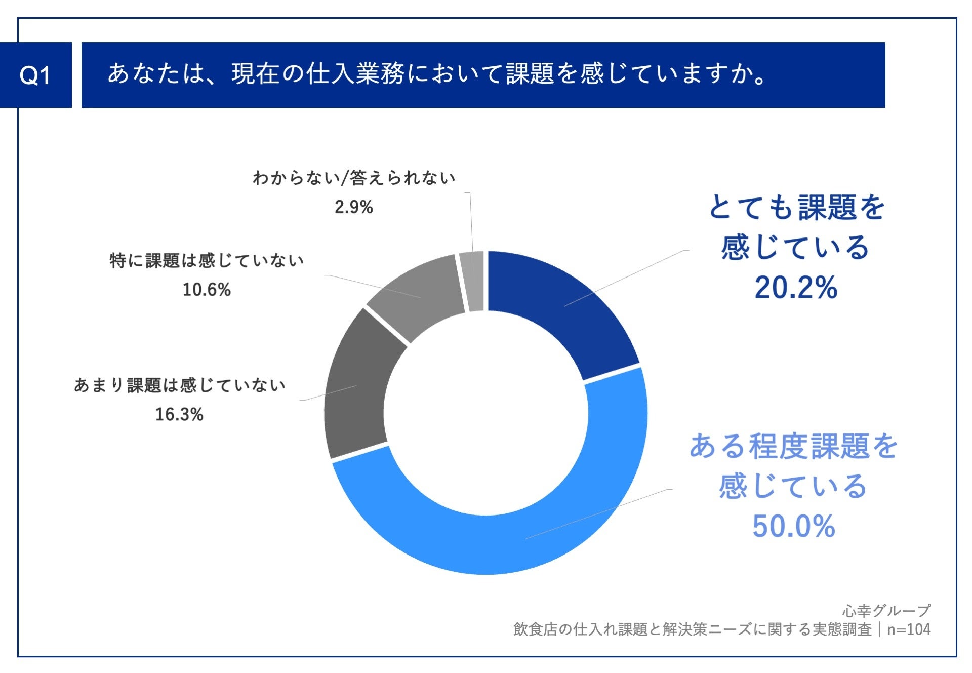 「Q1.あなたは、現在の仕入業務において課題を感じていますか。」(n=104)と質問したところ、「とても課題を感じている」が20.2%、「ある程度課題を感じている」が50.0%という回答となりました。