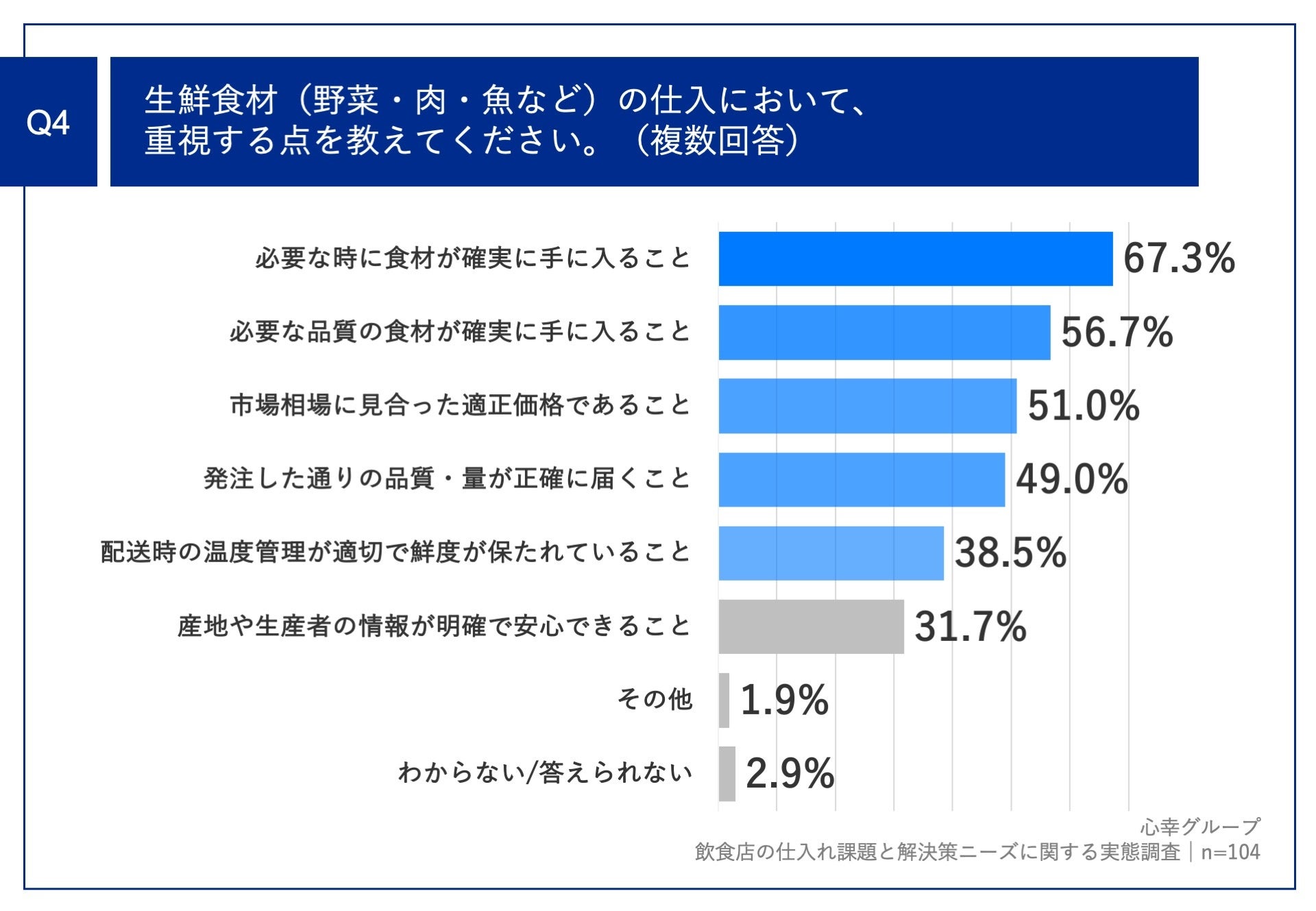 「Q4.生鮮食材(野菜・肉・魚など)の仕入において、重視する点を教えてください。(複数回答)」(n=104)と質問したところ、「必要な時に食材が確実に手に入ること」が67.3%、「必要な品質の食材が確実に手に入ること」が56.7%、「市場相場に見合った適正価格であること」が51.0%という回答となりました。