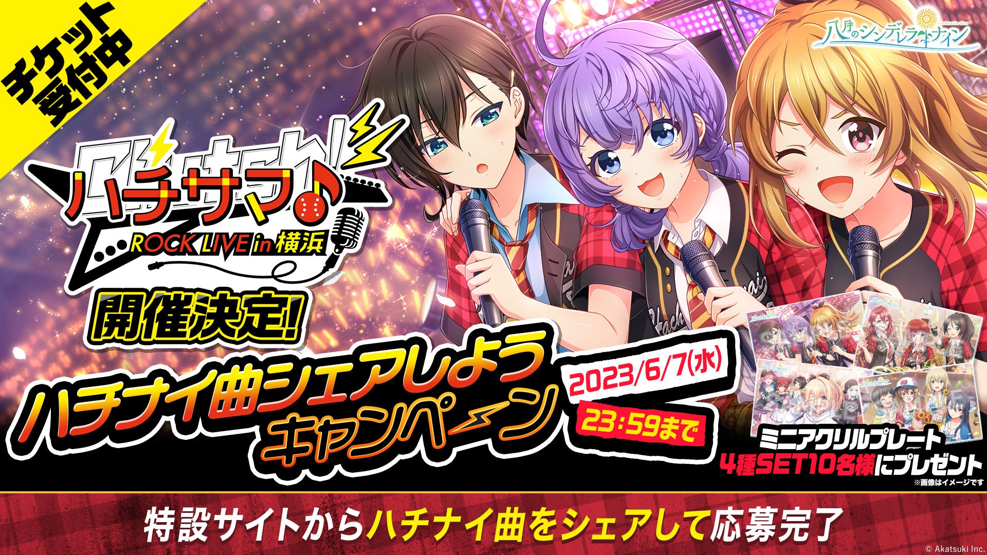 2023年8月13日(日)に開催する、「ハチサマ Clutch! ROCK LIVE in 横浜」を記念して、ハチナイ曲をシェアすると10名様にミニアクリルプレート4種SETがもらえるTwitterキャンペーンを開催予定です。
