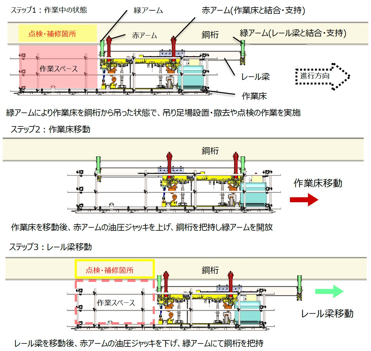 橋梁や高速道路のリニューアル、点検工事において、作業用の吊り足場を安全かつ効率的に組立・解体できる移動足場です。「ムーバルデッキ」は移動機構と作業床で構成されており、鋼桁の下フランジを把持(はじ)するアームによって、橋梁にぶら下がる形で懸吊(けんちょう)され、レール梁(緑アームで懸吊)と作業床(赤アームで懸吊)の支持を油圧により交互に入れ替え、アームをスライドさせることにより移動します(尺取り方式)。