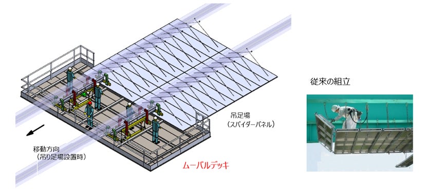 部材はすべて人力で搬入・組立・解体・搬出が可能な重量・寸法のため、クレーンなどの重機が不要です。作業床にはパネル式吊り足場(スパイダーパネル)を採用しており、スタートパネルに下部フレームと移動機構を取り付けることで「ムーバルデッキ」が完成します。吊り足場の組立に使用した後は、床材を吊り足場と同じレベルまで引き上げ、組立てた吊り足場と接続することで吊り足場の一部として使用できます。設置・撤去が容易なため、熟練工の不足という建設業界全体の課題解決にも貢献します。
