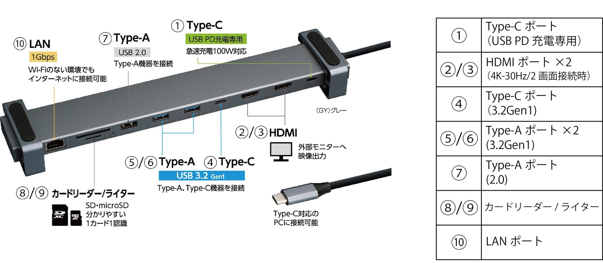 4Kデュアルモニター(2画面同時出力)に対応したHDMIポートや、PD対応のUSB充電ポートなど、活用の幅が広がるポート構成