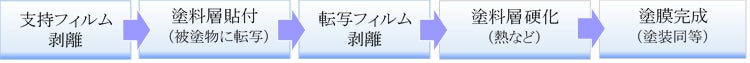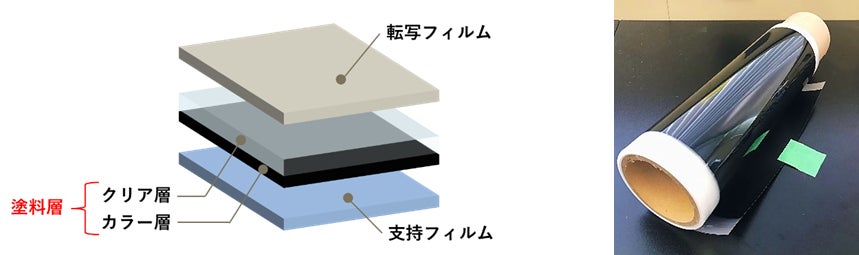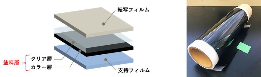 ・当社独自技術で膜化した塗料(塗料層)を転写フィルムと支持フィルムで挟んだ構成(図1)
