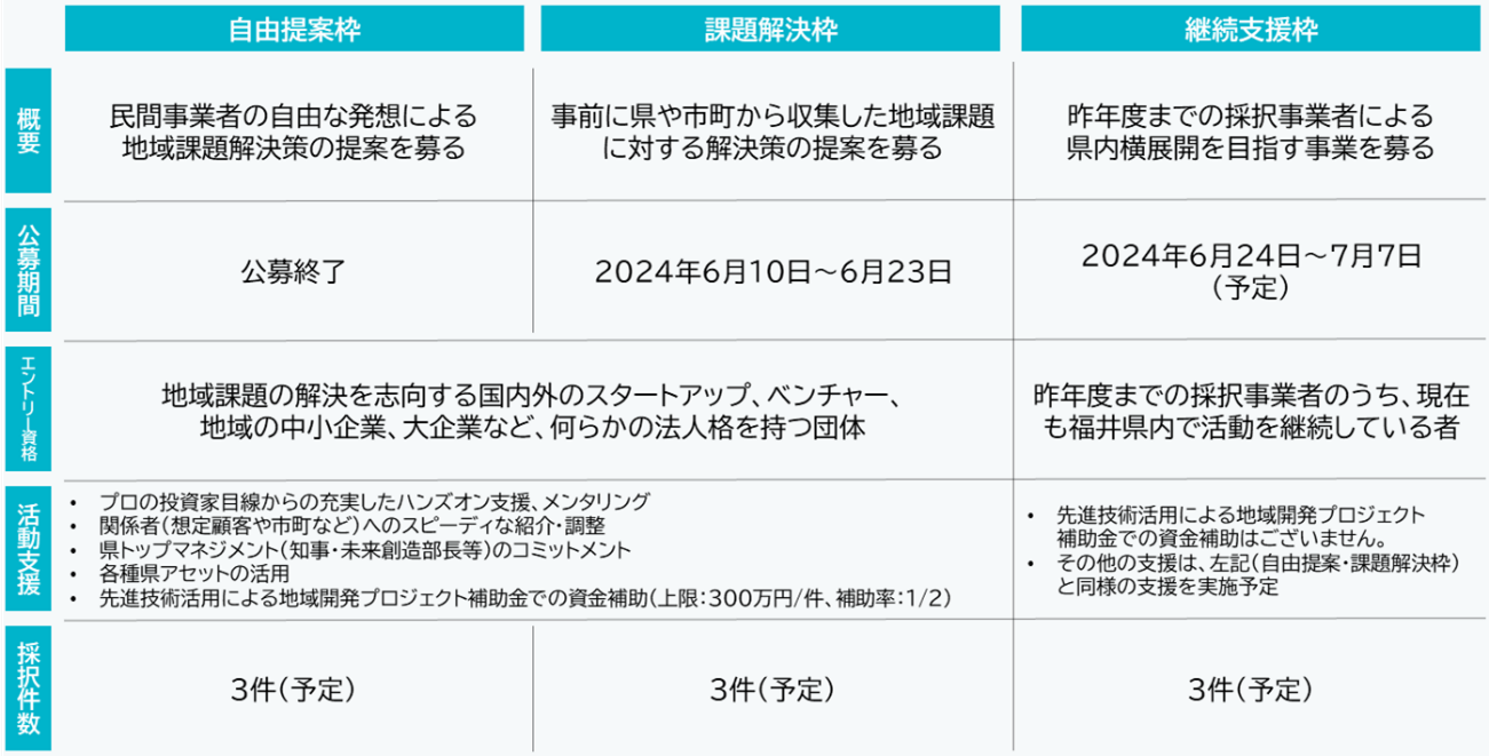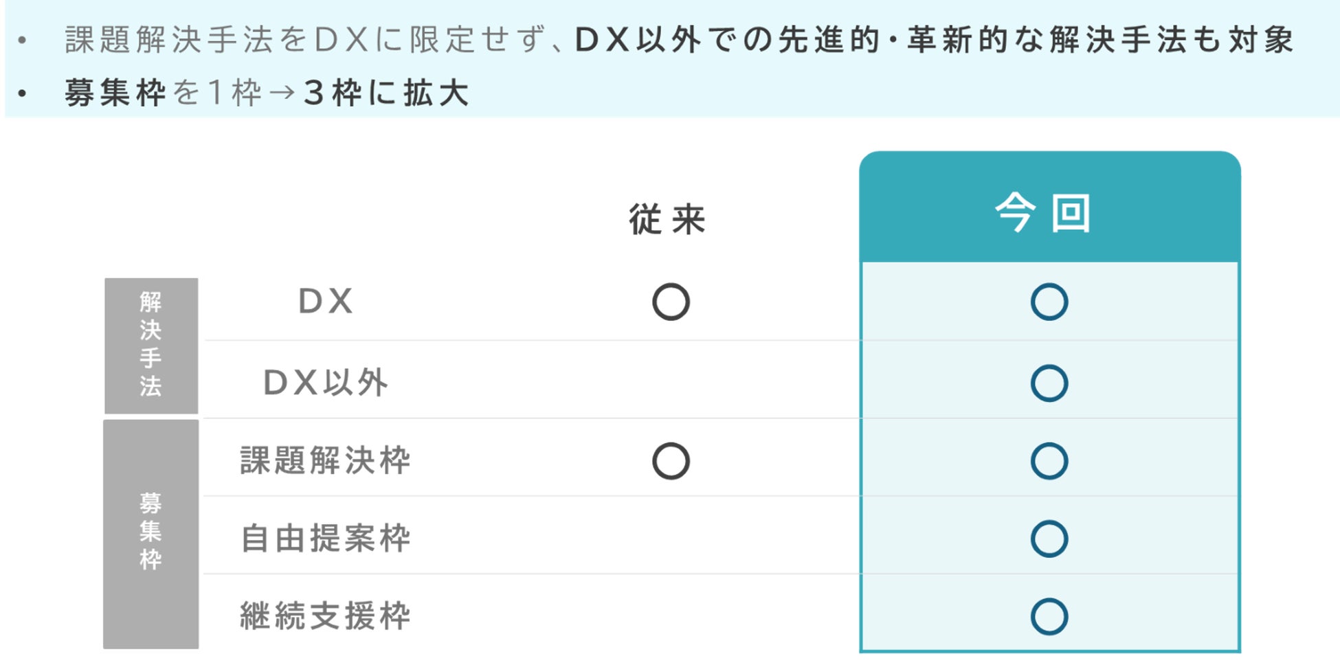また、募集枠も自由提案枠、課題解決枠、継続支援枠の3枠方式に変更しており、今回は第二弾(課題解決枠)の公募を開始します。